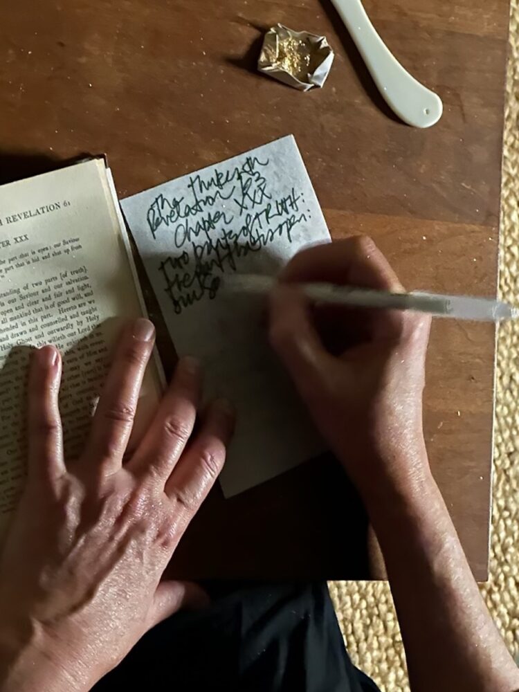 For the past year I have been drawing and painting in a copy of Revelations of Divine Love, responding to this visionary text with graphite, oil pastel, and watercolor paint. Inspired by Julian of Norwich’s mystical experiences, I find her medieval life equally compelling: for more than twenty years she lived alone in an anchorhold—a room attached to a church—and wrote what is now the earliest surviving text by a woman in English. She also offered spiritual guidance to pilgrims and visitors, speaking from behind a black window curtain adorned with a white cross. Exploring religious history and finding ways to combine contemplative and creative practice are recurring themes in my artwork. Recently I constructed a temporary enclosure next to a stone chapel; visitors were invited to enter the cell and engage in solitary reflection, reading and writing. The Center for Prayer and Pilgrimage in Washington’s National Cathedral hosted this participatory installation to celebrate the 650th anniversary of Julian’s visions.