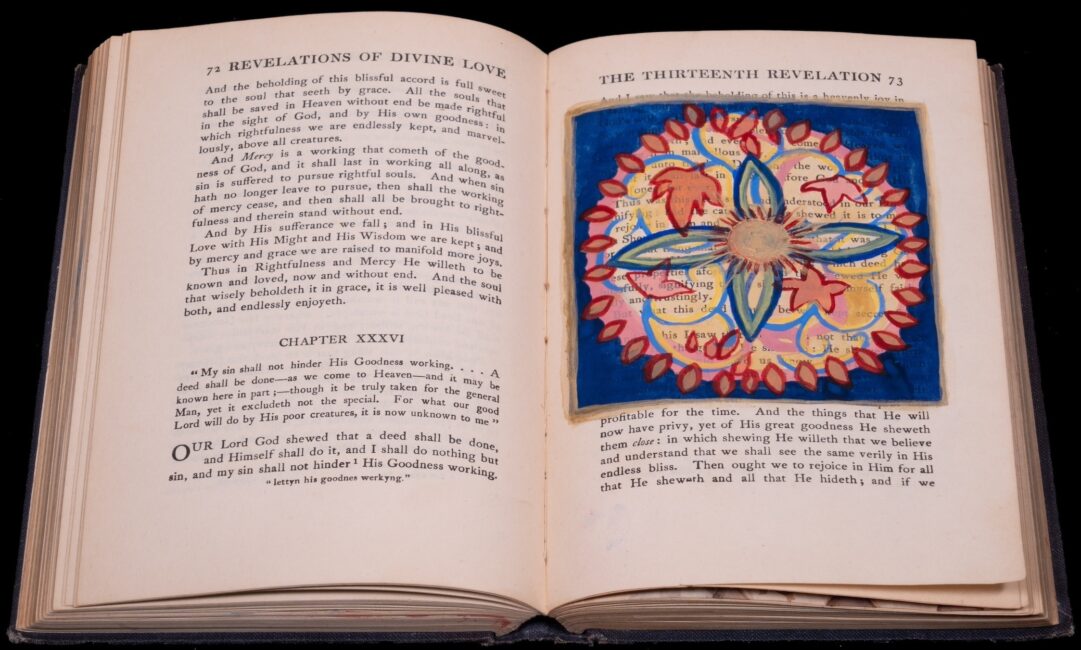 Altered artist book: Revelations of Divine Love, a version from the MS in the British Museum edited by Grace Warrack, 13th edition, 1949. Watercolor and gold paint.